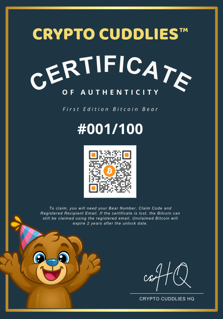 Inside, the recipient will find a QR code (on both the bear and the certificate) that lets them see their bear’s Bitcoin balance at any time - no crypto knowledge required.